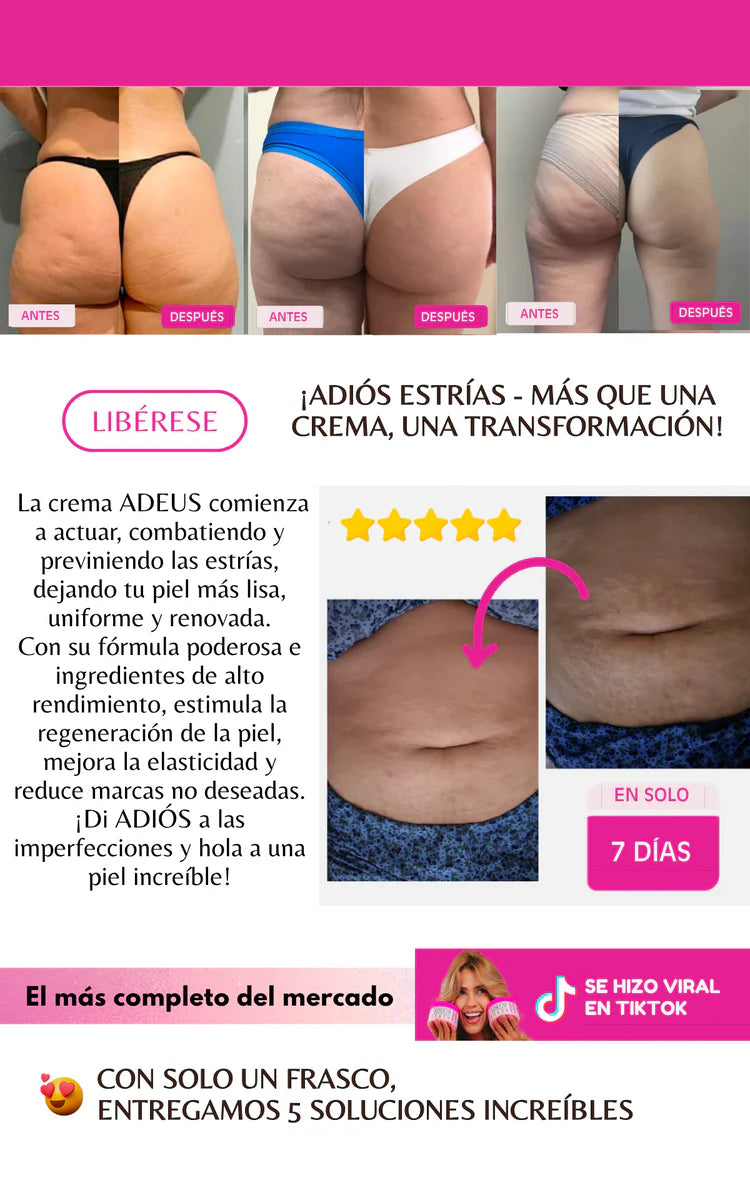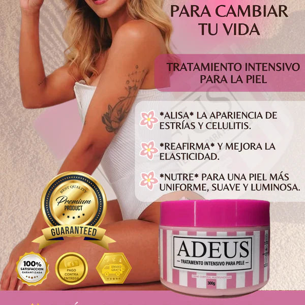 Descubre el poder de ADEUS, un tratamiento intensivo diseñado para transformar tu piel. ADEUS, con eficacia comprobada para combatir las estrías rojas y blancas, la celulitis y la flacidez, también ayuda a reducir medidas y promueve mejoras visibles en la apariencia de la piel desde la primera aplicación. Su fórmula combina ingredientes potentes y seguros capaces de nutrir, hidratar y revitalizar profundamente. ¿El resultado? Una piel más firme, suave y uniforme. Más que una simple crema, ADEUS es la opción preferida de miles de mujeres que están recuperando su autoestima y la libertad de lucir su cuerpo sin miedo.